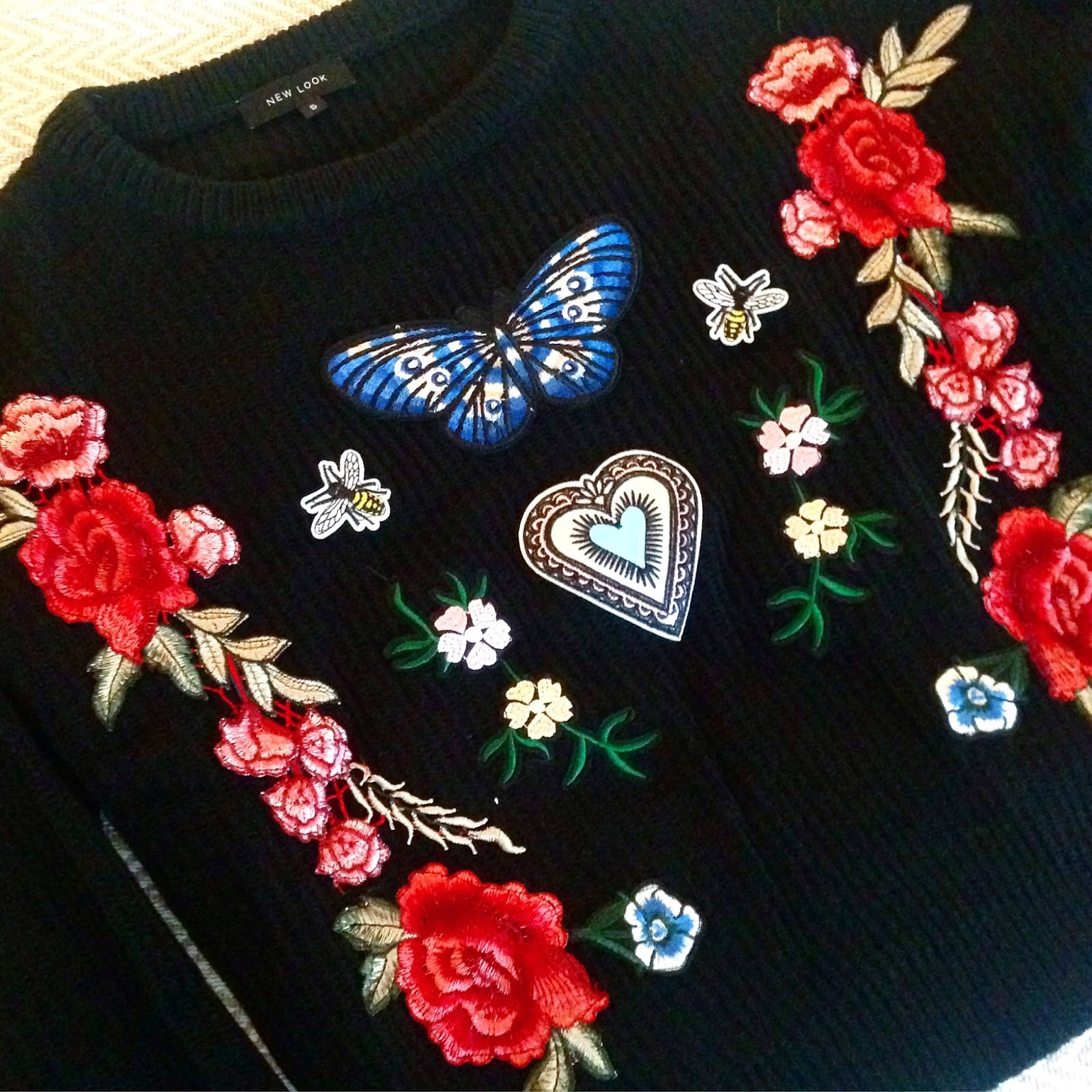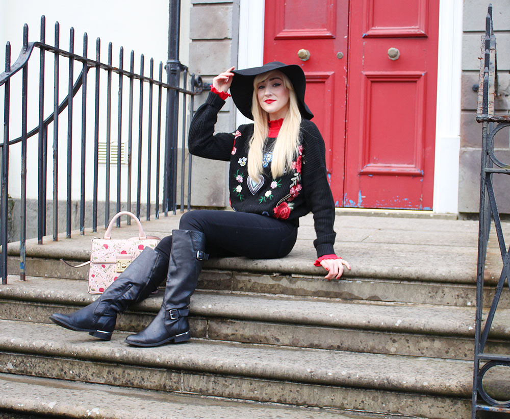 Black Floppy Hat- Topshop / Red Ribbed Jumper- H&M / Badge Embroidery Jumper- New Look/ Black Boots- Primark/ Black Jeans- Topshop / Floral Faux Leather Bag- Marks and Spencer's